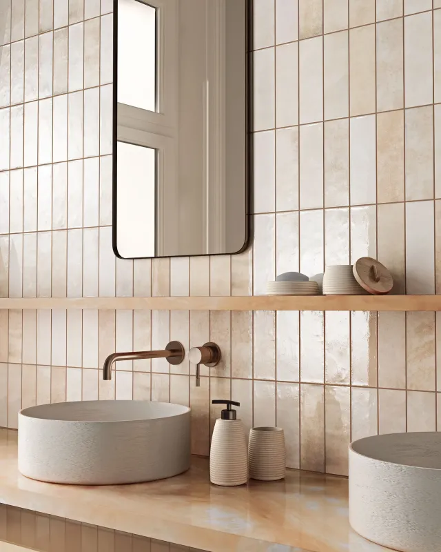Pytka Bliss Beige Gloss 6,5x20 cm to beżowo płytka gresowa typu cegiełka o błyszczącej powierzchni.