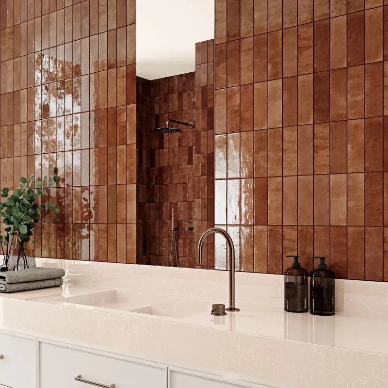 Pytka Bliss Cotto Gloss 6,5x20 cm to brązowa płytka gresowa typu cegiełka o błyszczącej powierzchni.