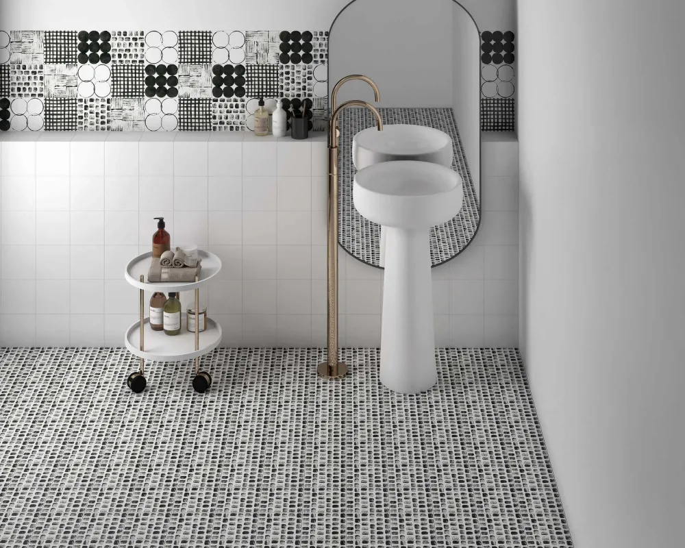 Crayon Feet 15x15 to biało-czarna płytka gresowa o wzorze geometrycznym i matowej powierzchni.