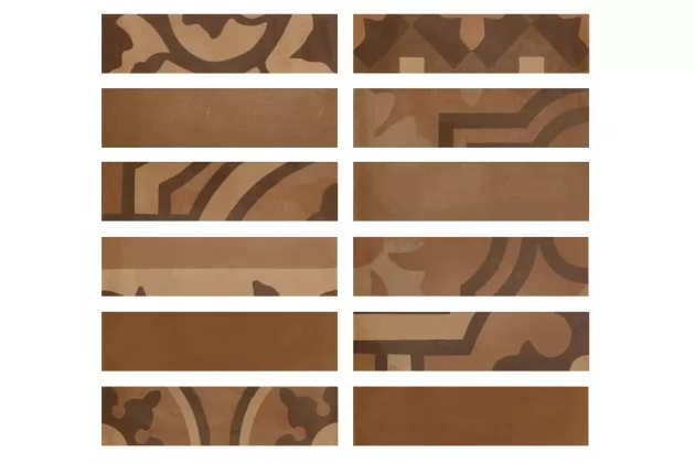 D_Segni Blend Listello Terra 5x20 to ceglasta płytka gresowa w kształcie cegiełki z wzorem geometrycznym.