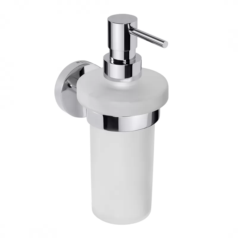 Dozownik na mydło 230ml wiszący Omega wykonany z mosiądzu z optyką chromowaną i i matowym szkłem mocowany na stałe do ściany.