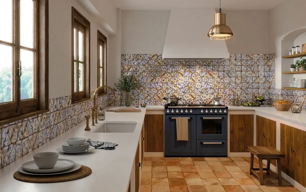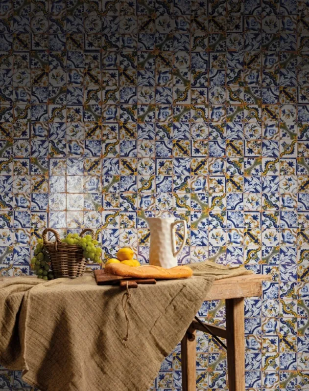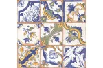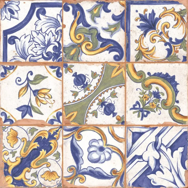 FS Campania Amalfi LT 33x33 cm to wzorzysta płytka na czerwonym podkładzie w delikatym niebieskim wzorze o matowej powierzchni.