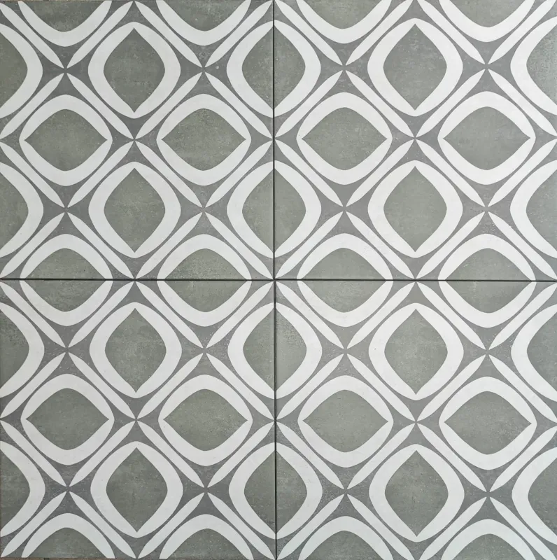 Płytka Galway Sage 33x33 cm to wzorzysta płytka gresowa o gładkiej matowejj powierzchni z wzorem geometryczny. Płytka utrzymana w kolorystyce herbacianej zieleni i złamanej bieli, z delikatnym efektem przetarcia.