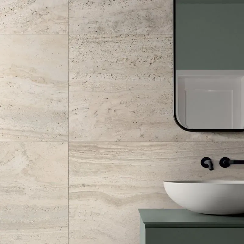 Popularny od czasów rzymskich trawertyn był jednym z najczęściej stosowanych rodzajów marmuru w starożytnych budowlach i nadal wpływał na twórczość artystów i architektów aż do czasów nowożytnych i współczesnych. Materiał ten można łatwo rozpoznać po charakterystycznych otworach w powierzchni, które po montażu należy wypełnić cementem lub żywicą. Trójwymiarowy efekt graficzny pozwala Flavikerowi odtworzyć surowy wygląd niewypełnionego trawertynu, tworząc unikalny i efektowny efekt końcowy, który łączy estetykę oryginalnego materiału z wszechstronnością i praktycznością ceramiki. Wygląd płyt trawertynowych zależy również od kierunku, w którym cięte są wydobyte bloki. Kolekcja NAVONA wyróżnia się nie tylko zadziwiająco realistycznym wyglądem, ale także tym, że każdy kolor jest dostępny w dwóch wersjach graficznych: VEIN i CROSS. Cięcie żył to najstarsza i najpowszechniej stosowana technika cięcia trawertynu. Uwydatnia ona warstwy materiału wapiennego osadzonego w epokach geologicznych i tworzy płyty z wyraźnie widocznymi, kontrastującymi prążkami. Płyty uzyskane metodą CROSS CUTTING (tj. cięcia w kierunku przeciwnym do kierunku cięcia płyt z żyłami) charakteryzują się jasnymi i ciemnymi obszarami zmętnienia, które przypominają inne rodzaje materiałów.