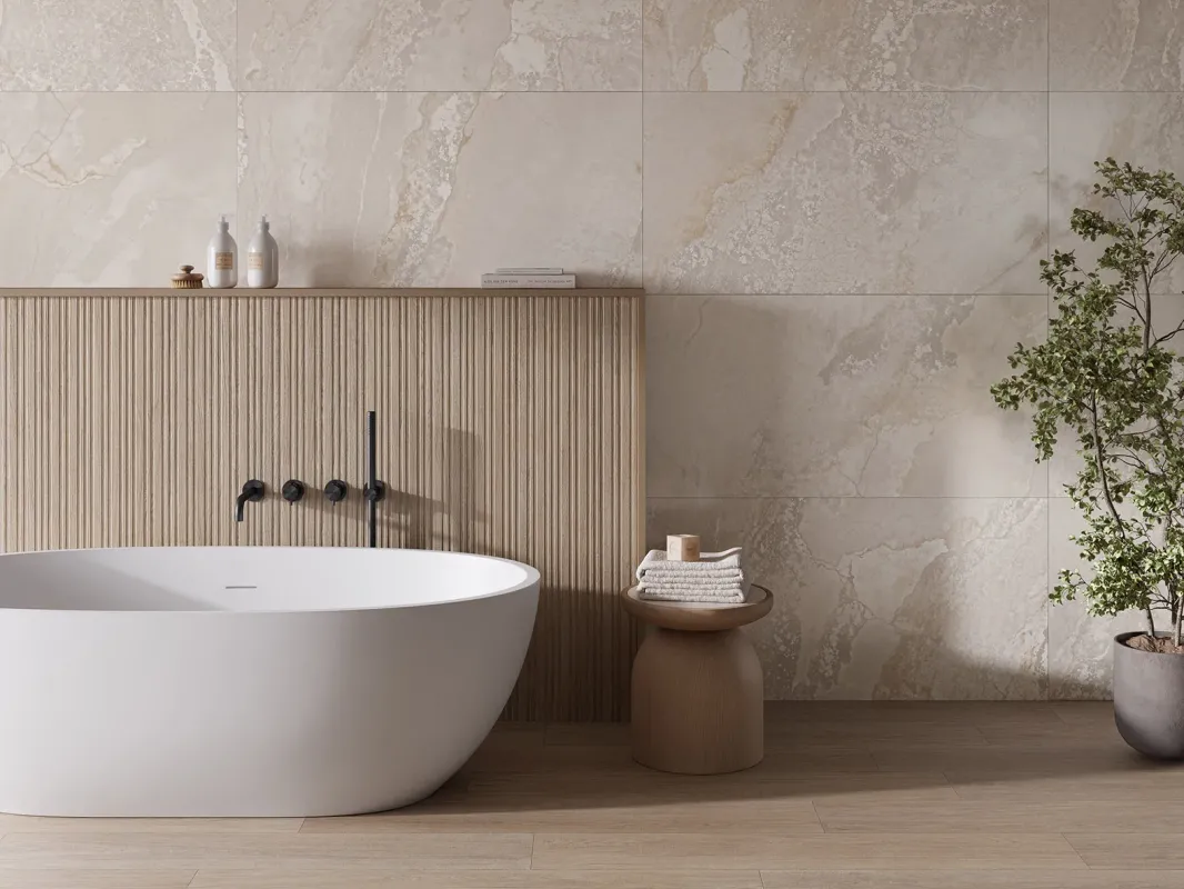 Re Cosmos Cream Matt Rect. 60x120 cm to beżowa płytka ścienna imitująca oksydujący metal o matowej powierzchni.