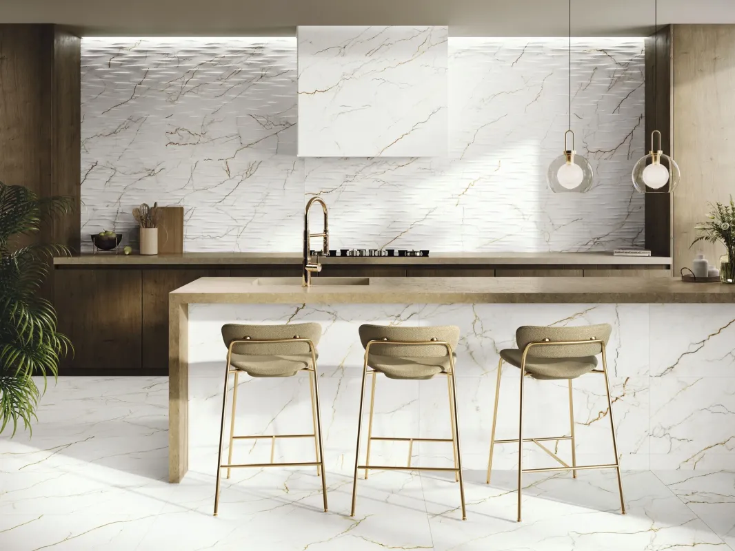 Białe płytki imitujące marmur o ciemno złotym użyleniu z kolekcji Adaggio to synonim elegancji dający efekt wyszukanego wnętrza. Są to klasyczne i eleganckie płytki gresowe i ścienne imitujące naturalny biały marmur dostępne w szerokiej gamie formatów począwszy od rozmiaru 60x60 , 60x120, 120x120, 40x120 a na 120x260 skończywszy. Adaggio to hiszpańskie płytki o uniwersalnym zastosowaniu, można je układać jako płytki podłogowe jak i płytki ścienne w przypadku płytek na gresowym podkładzie. Ciekawa propozycją są w tym przypadku płytki wielkoformatowe 120x260 o grubości 6 mm, które nadadzą każdemu pomieszczeniu wyjątkowej elegancji i wyjątkowego efektu. Płytki ścienne z kolekcji Adaggio produkowane są na białym podkładzie w formacie 40x120, do gładkiej glazury bazowej producent zaproponował trzy różne dekoracje o strukturalnej i trójwymiarowej powierzchni, Flash Adaggio Gold 40x120 to płytki o trójwymiarowej powierzchni, płytki Ornamento Adaggio Gold 40x120 imitują nadrukiem efekt dekoracyjnej tapety natomiast dekoracja Tonn Adaggio Gold 40x120 to płytka z efektem fali na powierzchni. Wszystkie płytki z tej kolekcji maja błyszczącą gładką powierzchnię i rektyfikowane krawędzie. Seria tych płytek to przykład produktów które można wykorzystać zarówno we wnętrzach mieszkalnych, np. jako płytki łazienkowe, w salonie, jako płytki do kuchni, czy kafle do holu, oraz we wnętrzach publicznych typu hotele, restauracje, biura, sale konferencyjne.