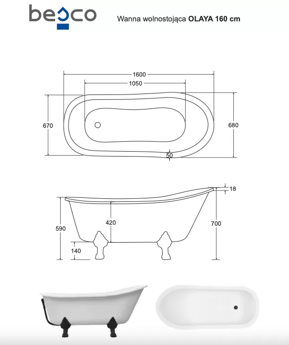 Wanna wolnostojąca Otylia biała 160x68 180L z nogami w kolorze chromu. Wanna wolnostojąca wykonana jest z akrylu sanitarnego. Wanna również dostępna jest w wykończeniu Besco Glam w kolorach zewnętrzych: złotym, srebrnym lub grafitowym.